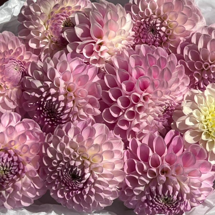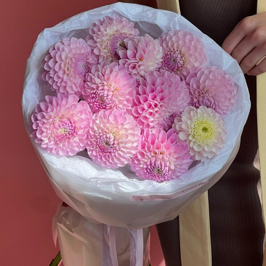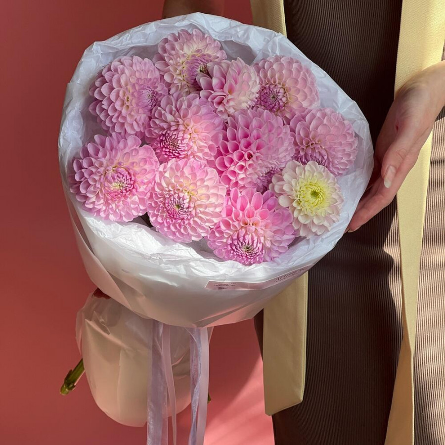 На фото букет из 11 розовых георгин. В составе: георгина 11 шт, дизайнерская упаковка 2 шт, атласная лента 1 шт, . Все цветы свежие и ароматные, букет красиво оформлен и отлично подходит для подарка. Доступна доставка цветов или самовывоз.