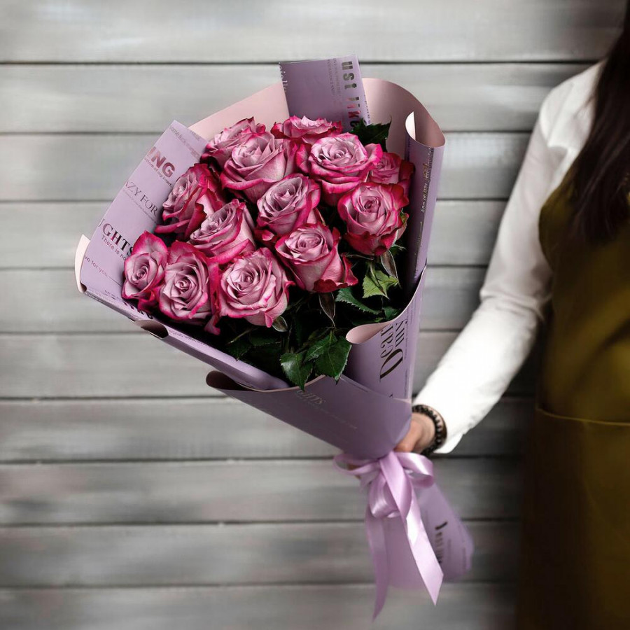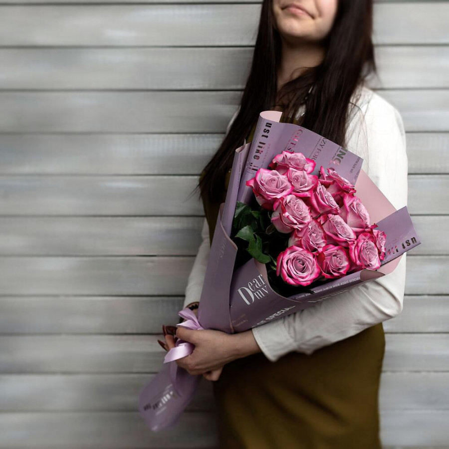 На фото букет из 13 фиолетовых роз. В составе: роза 13 шт, дизайнерская упаковка 1 шт, атласная лента 1 шт, . Все цветы свежие и ароматные, букет красиво оформлен и отлично подходит для подарка. Доступна доставка цветов или самовывоз.