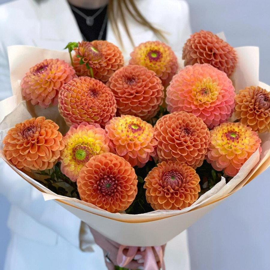 На фото монобукет из 15 оранжевых георгин. В составе: георгина 15 шт, писташ 3 шт, дизайнерская упаковка 1 шт, атласная лента 1 шт, . Все цветы свежие и ароматные, букет красиво оформлен и отлично подходит для подарка. Доступна доставка цветов или самовывоз.