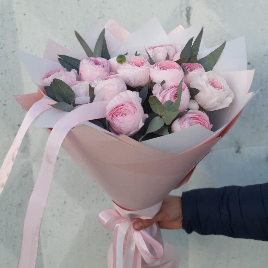 На фото букет из 15 розовых ранункулюсов. В составе: ранункулюс 15 шт, эвкалипт 2 шт, дизайнерская упаковка 1 шт, атласная лента 1 шт, . Все цветы свежие и ароматные, букет красиво оформлен и отлично подходит для подарка. Доступна доставка цветов или самовывоз.