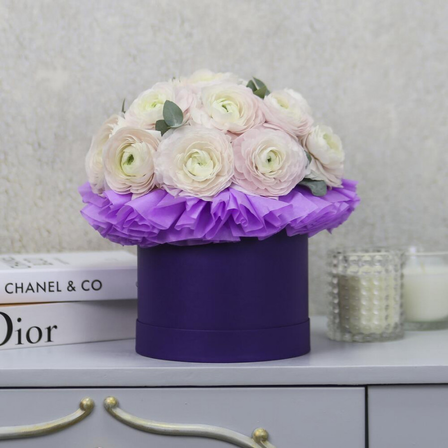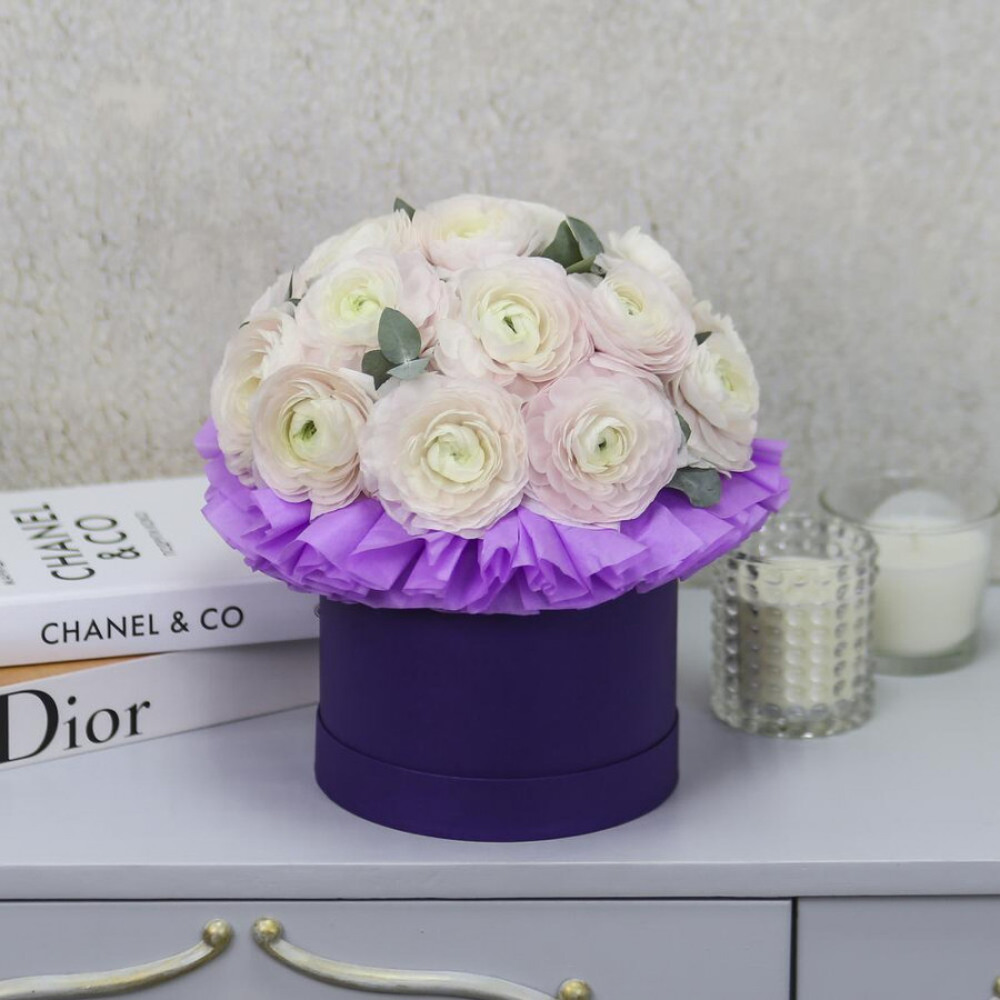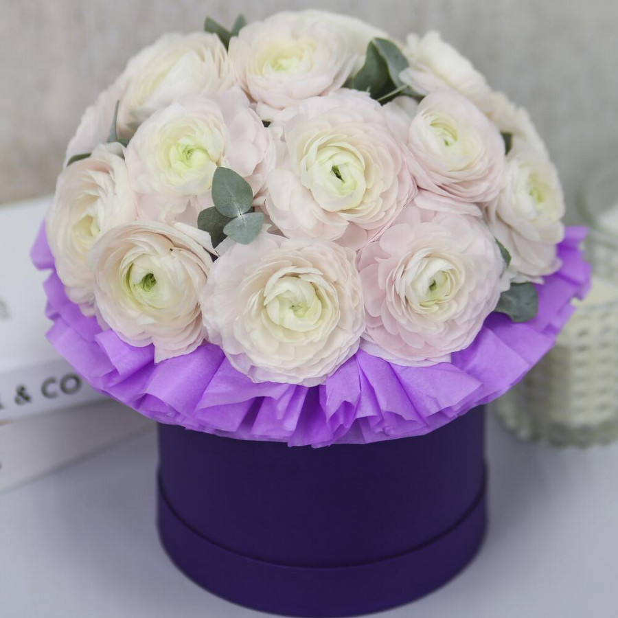 17 белых ранункулюсов в шляпной коробке в Дубне