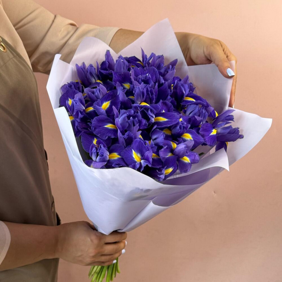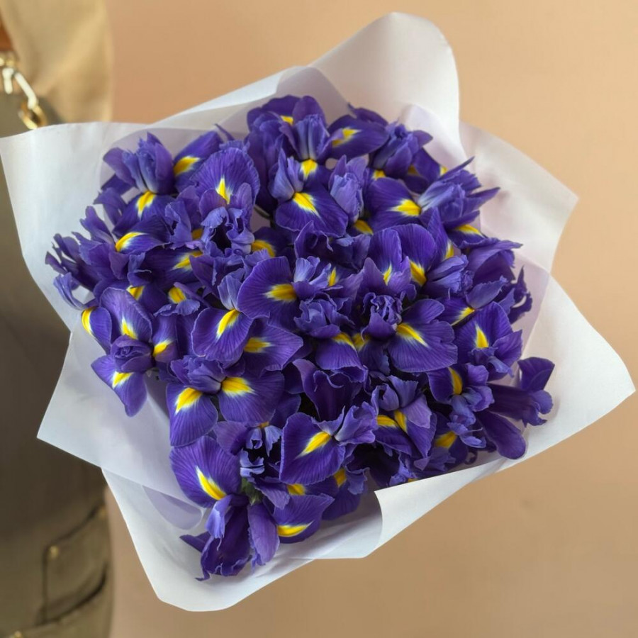На фото букет из 25 синих ирисов. В составе: ирис 25 шт, дизайнерская упаковка 1 шт, атласная лента 1 шт, . Все цветы свежие и ароматные, букет красиво оформлен и отлично подходит для подарка. Доступна доставка цветов или самовывоз.