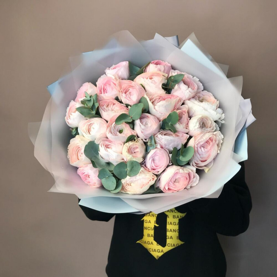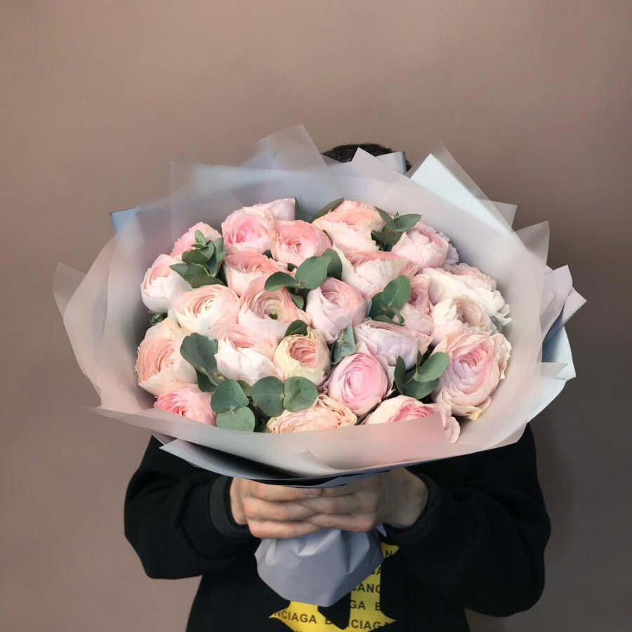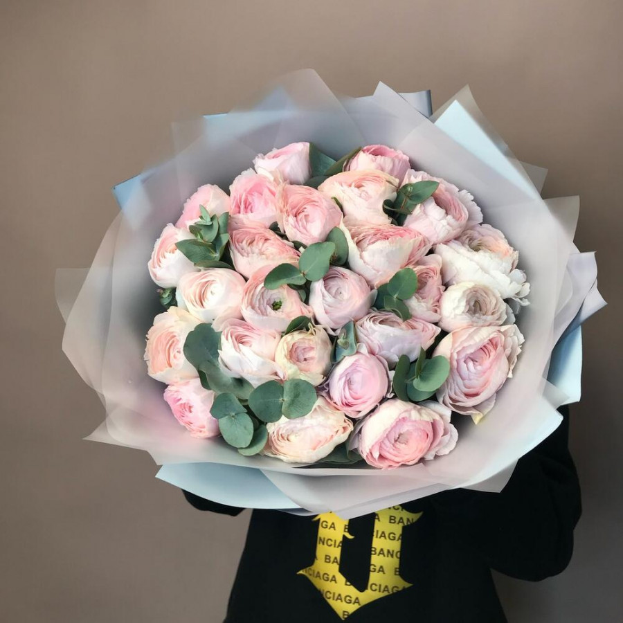 На фото букет из 25 розовых ранункулюсов. В составе: ранункулюс 25 шт, эвкалипт 10 шт, дизайнерская упаковка 1 шт, банксия 0 шт, . Все цветы свежие и ароматные, букет красиво оформлен и отлично подходит для подарка. Доступна доставка цветов или самовывоз.