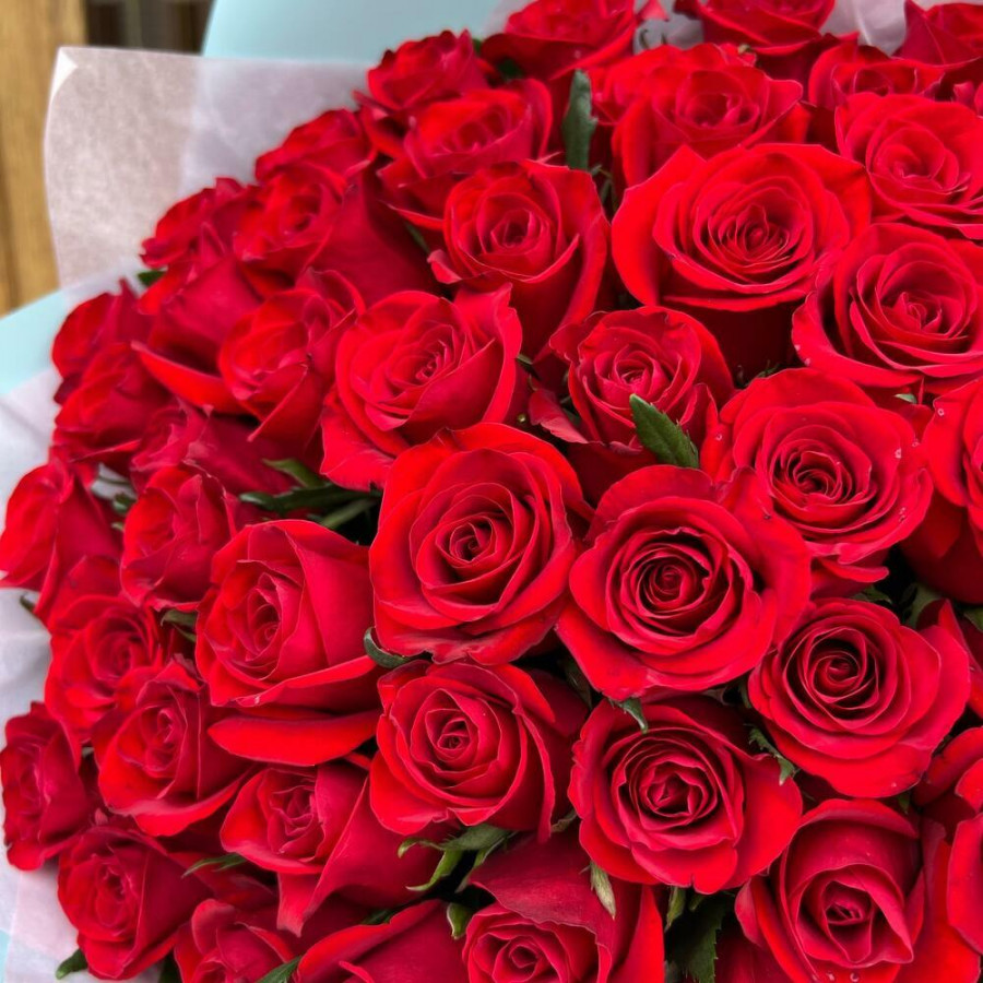 На фото букет из 45 красных роз. В составе: роза 45 шт, дизайнерская упаковка 1 шт, атласная лента 1 шт, . Все цветы свежие и ароматные, букет красиво оформлен и отлично подходит для подарка. Доступна доставка цветов или самовывоз.