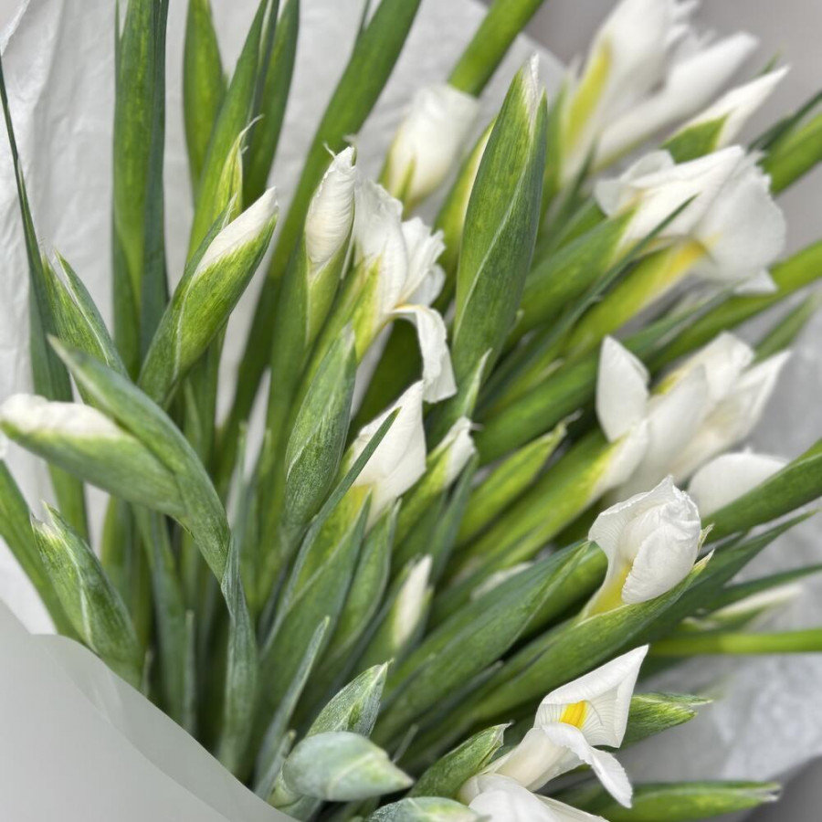 На фото нежный букет из 49 белых ирисов. В составе: ирис 49 шт, дизайнерская упаковка 2 шт, атласная лента 1 шт, . Все цветы свежие и ароматные, букет красиво оформлен и отлично подходит для подарка. Доступна доставка цветов или самовывоз.