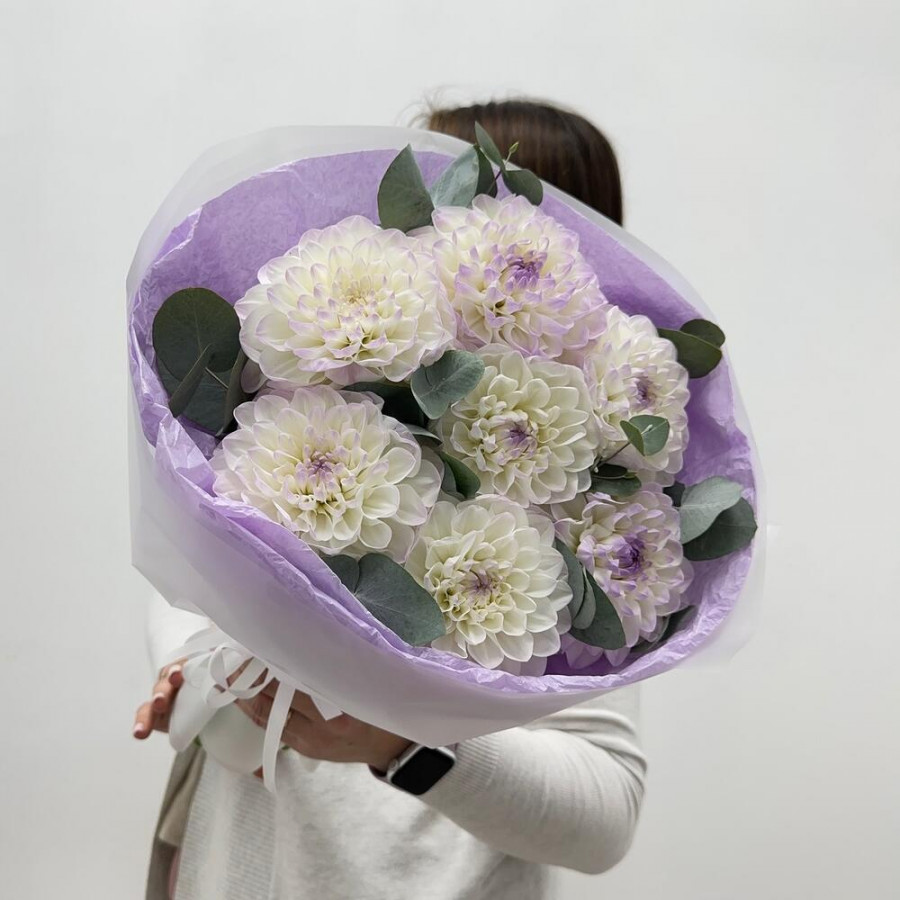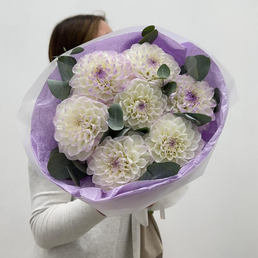Букет из 7 бело-лиловых георгин с эвкалиптом в Дубне