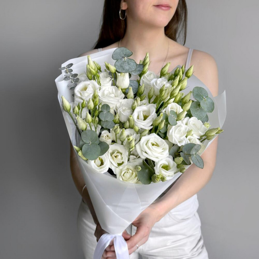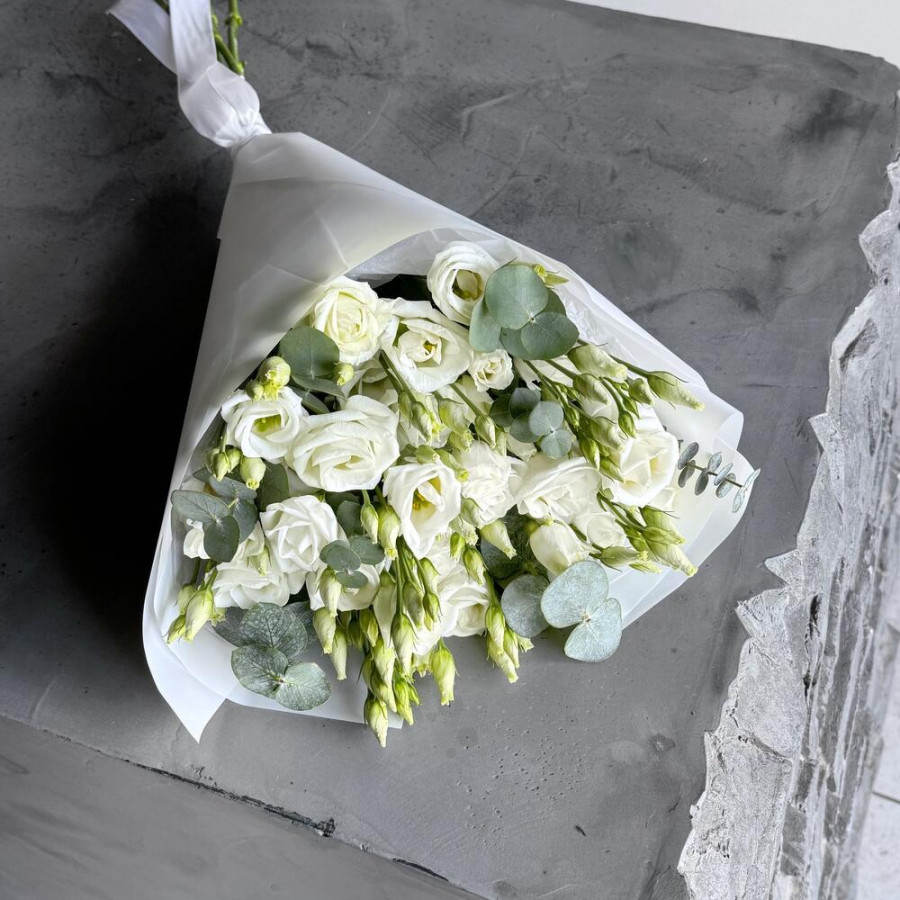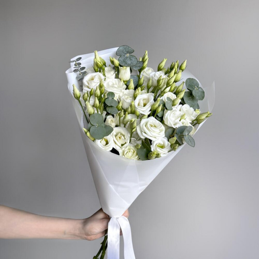 Букет из 7 белых эустом и эвкалипта в Дубне