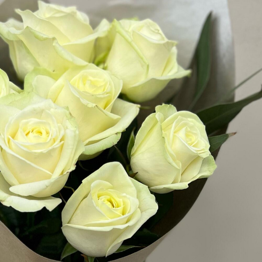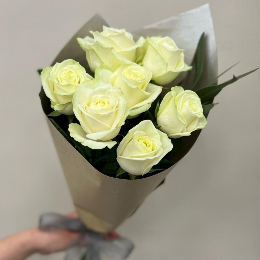 На фото букет из 7 белых роз. В составе: роза 7 шт, крафт-бумага 1 шт, атласная лента 1 шт, . Все цветы свежие и ароматные, букет красиво оформлен и отлично подходит для подарка. Доступна доставка цветов или самовывоз.