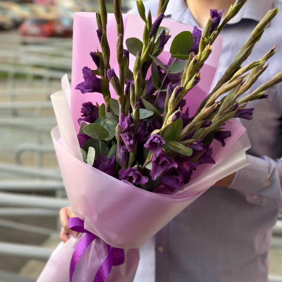 На фото букет из 9 фиолетовых гладиолусов. В составе: гладиолус 9 шт, дизайнерская упаковка 2 шт, атласная лента 2 шт, . Все цветы свежие и ароматные, букет красиво оформлен и отлично подходит для подарка. Доступна доставка цветов или самовывоз.