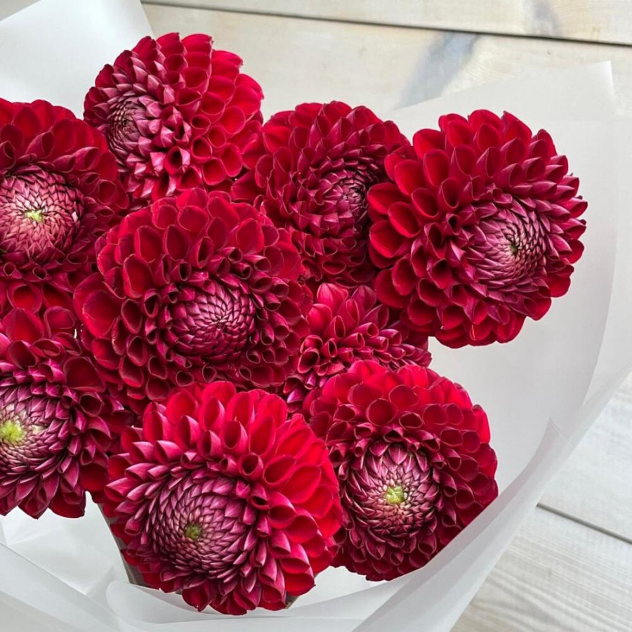 На фото букет из 9 красных георгин. В составе: георгина 9 шт, дизайнерская упаковка 1 шт, атласная лента 1 шт, . Все цветы свежие и ароматные, букет красиво оформлен и отлично подходит для подарка. Доступна доставка цветов или самовывоз.