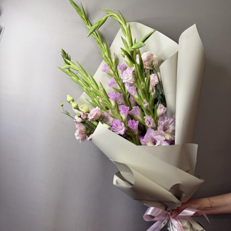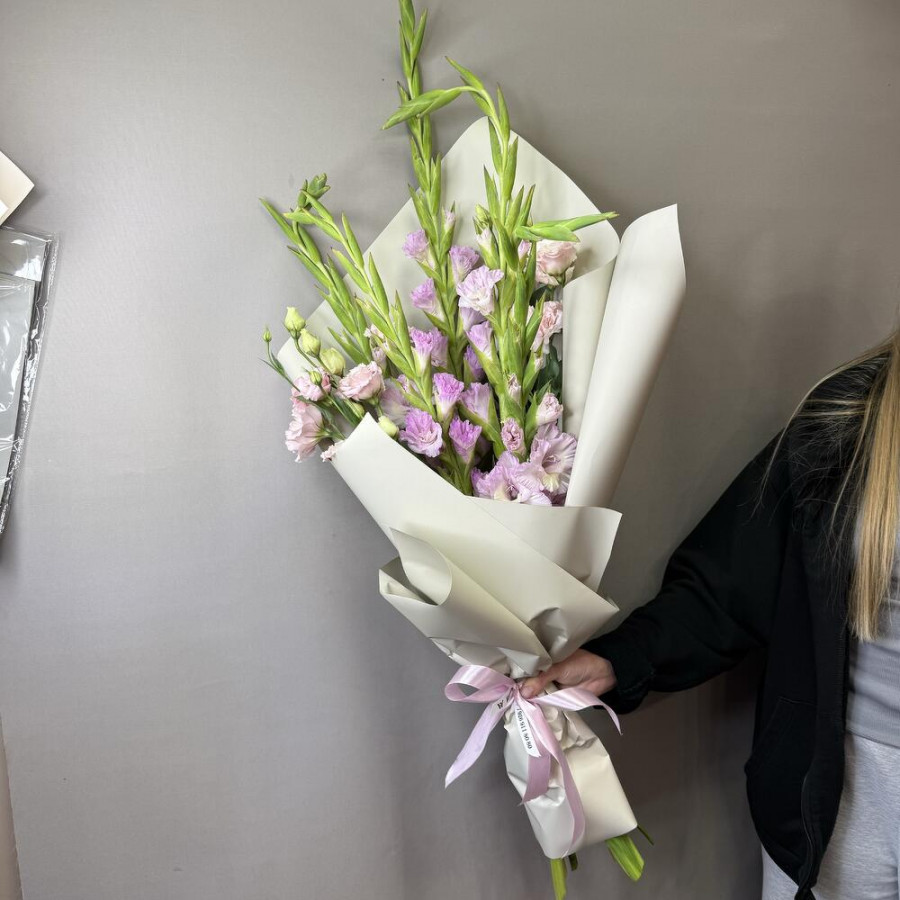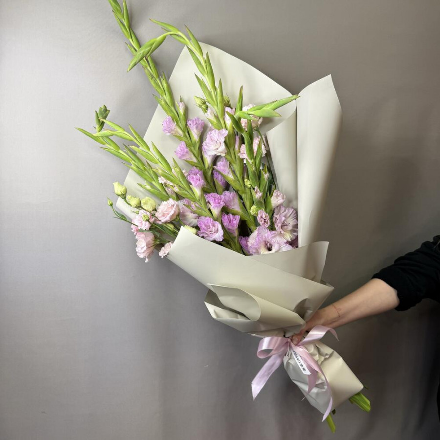 Эустома - 2 шт. Лента атласная - 2 шт. Гладиолус - 5 шт. Упаковка дизайнерская - 3 шт.