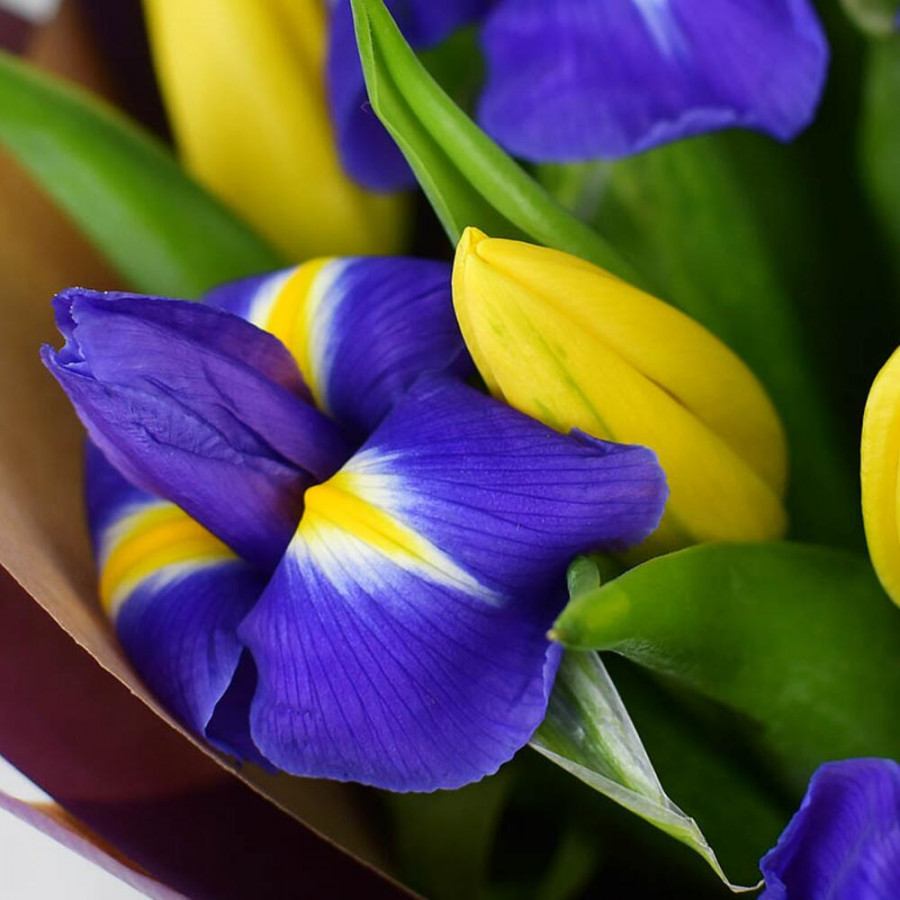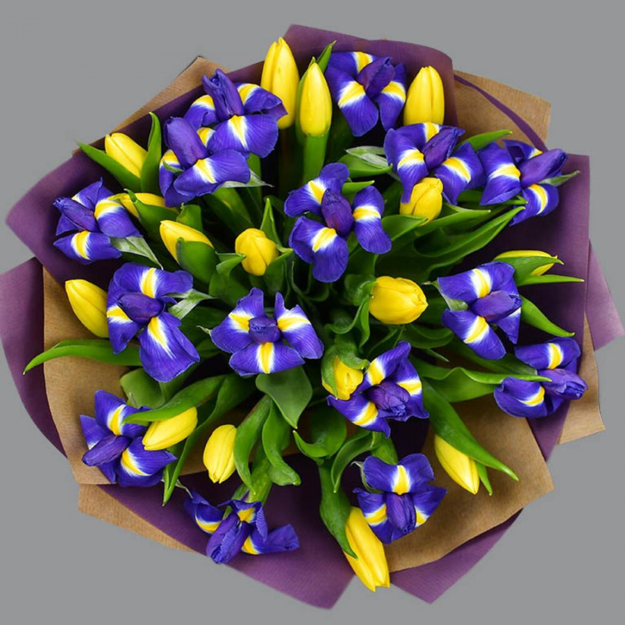 Букет из синих ирисов и желтых тюльпанов в Дубне