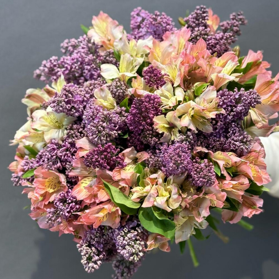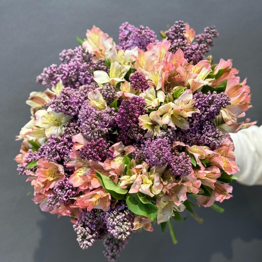 На фото букет из альстромерий и сирени. В составе: сирень 17 шт, альстромерия 14 шт, атласная лента 2 шт, . Все цветы свежие и ароматные, букет красиво оформлен и отлично подходит для подарка. Доступна доставка цветов или самовывоз.