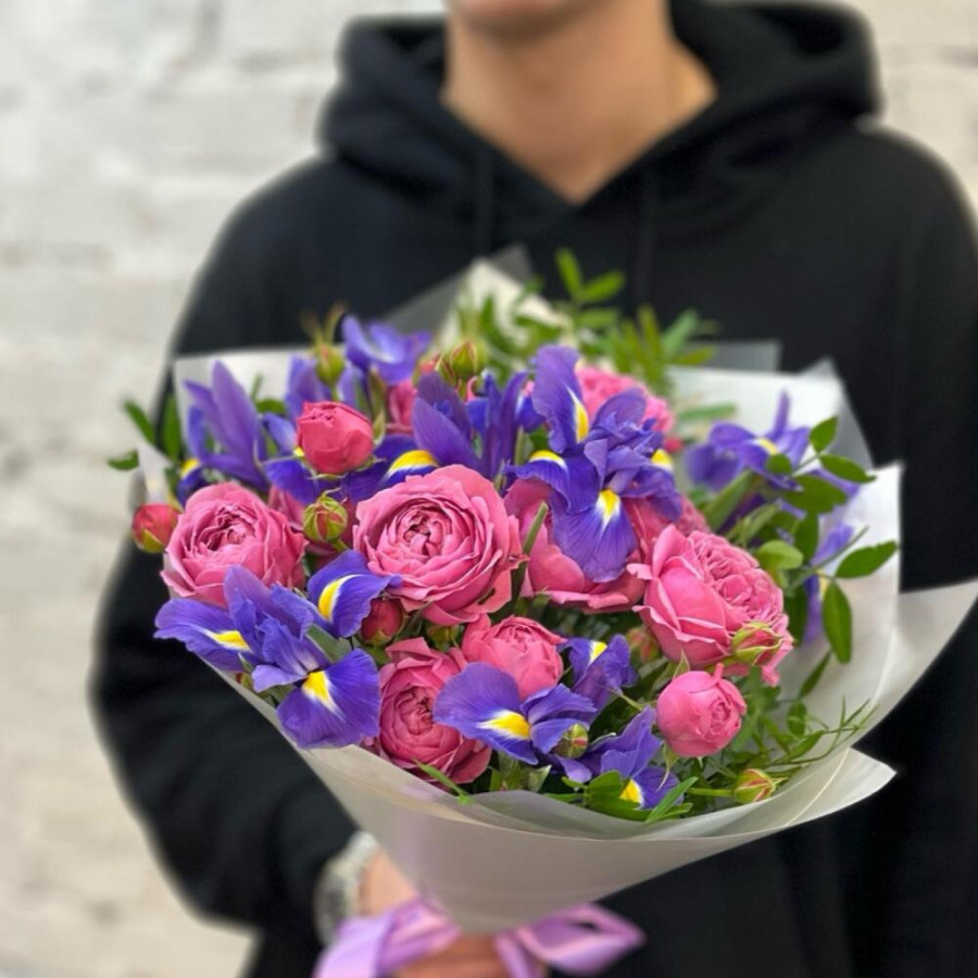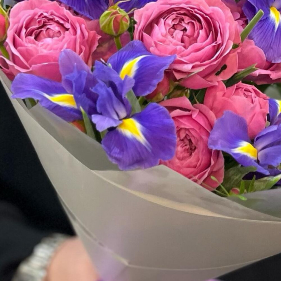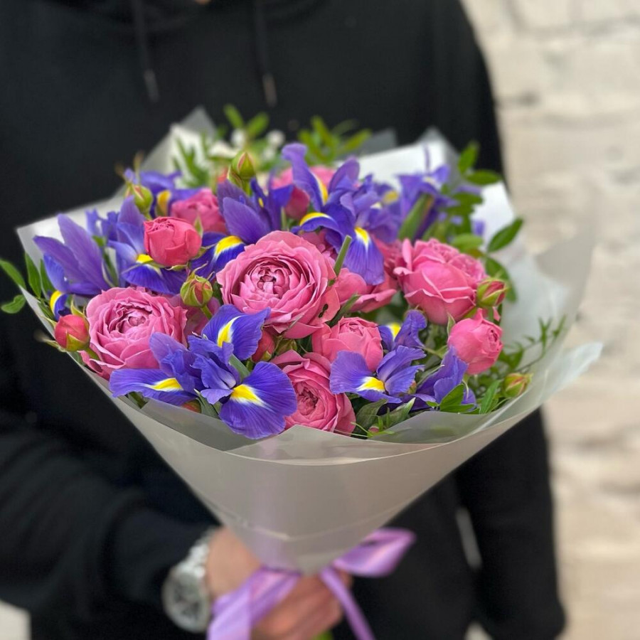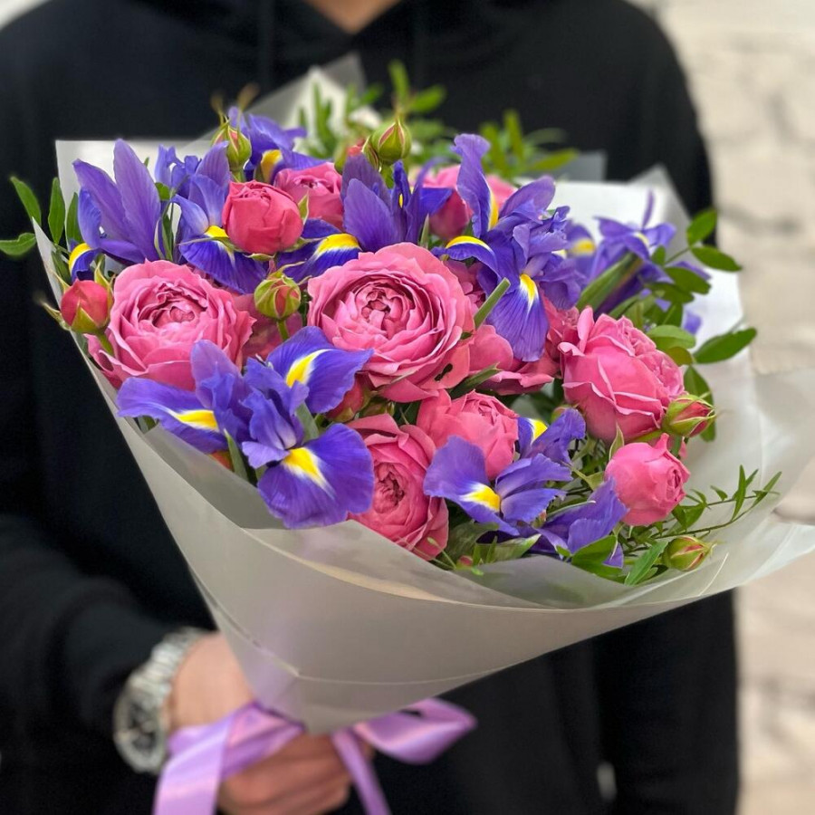 Букет из розовых пионовидных роз и синих ирисов в Дубне