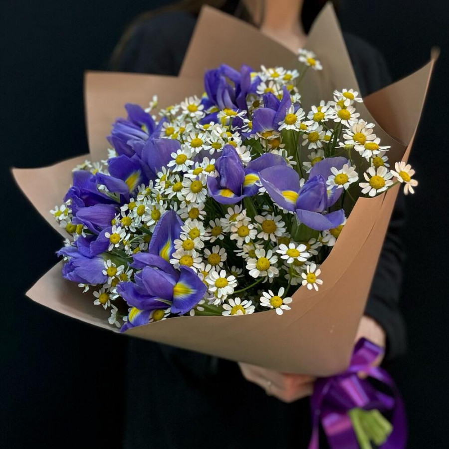 На фото букет из синих ирисов и танацетума. В составе: ирис 9 шт, танацетум 6 шт, крафт-бумага 1 шт, атласная лента 1 шт, . Все цветы свежие и ароматные, букет красиво оформлен и отлично подходит для подарка. Доступна доставка цветов или самовывоз.