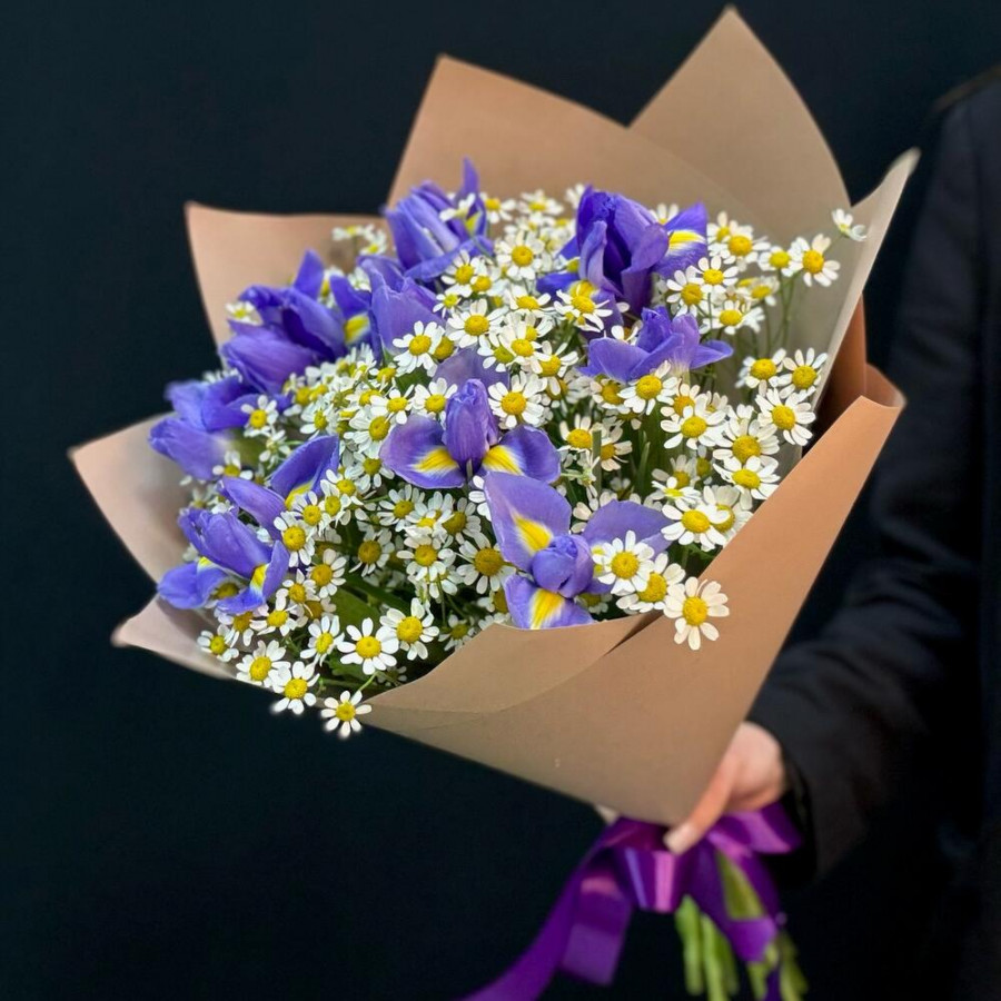 Букет из синих ирисов и танацетума