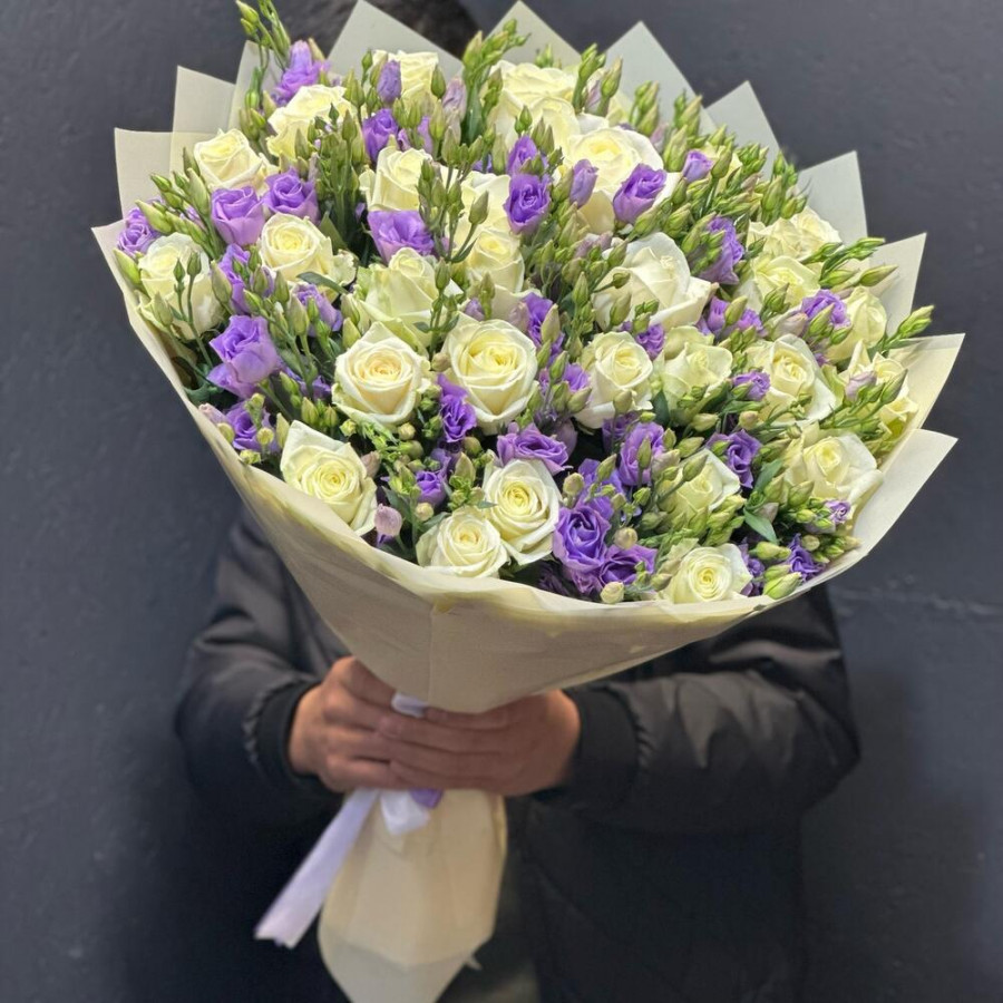 На фото букет из сиреневых эустом и белых роз. В составе: эустома (лизиантус) 21 шт, роза 30 шт, дизайнерская упаковка 3 шт, атласная лента 2 шт, . Все цветы свежие и ароматные, букет красиво оформлен и отлично подходит для подарка. Доступна доставка цветов или самовывоз.