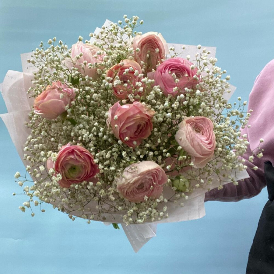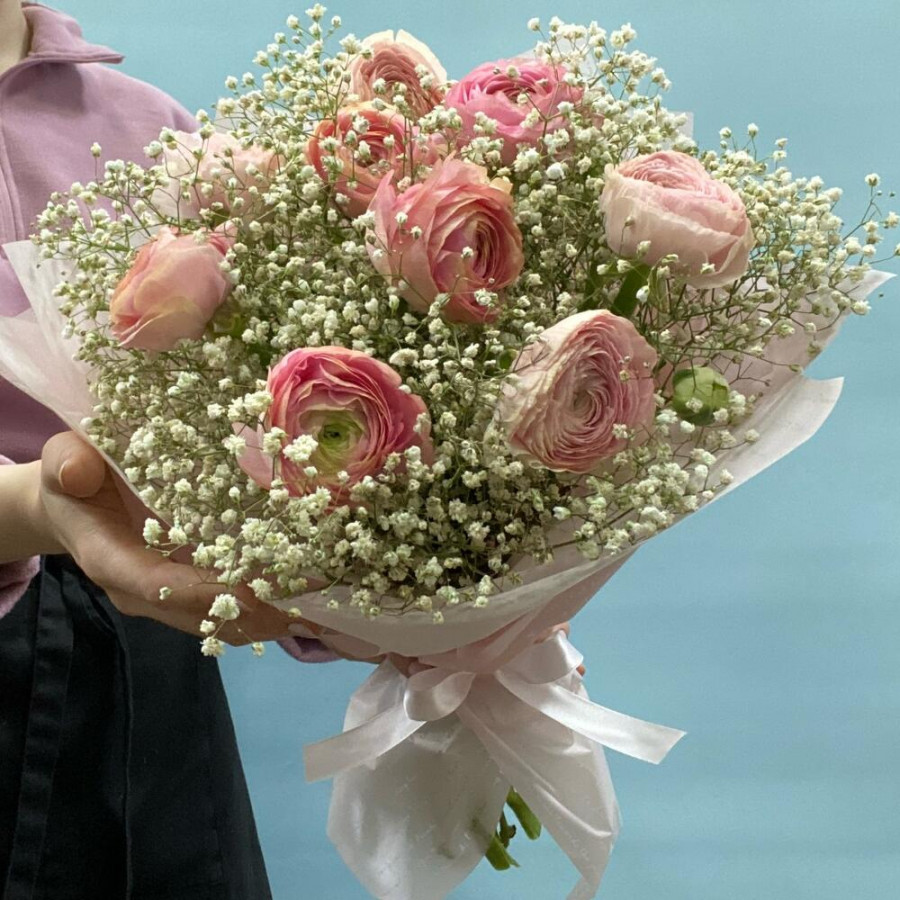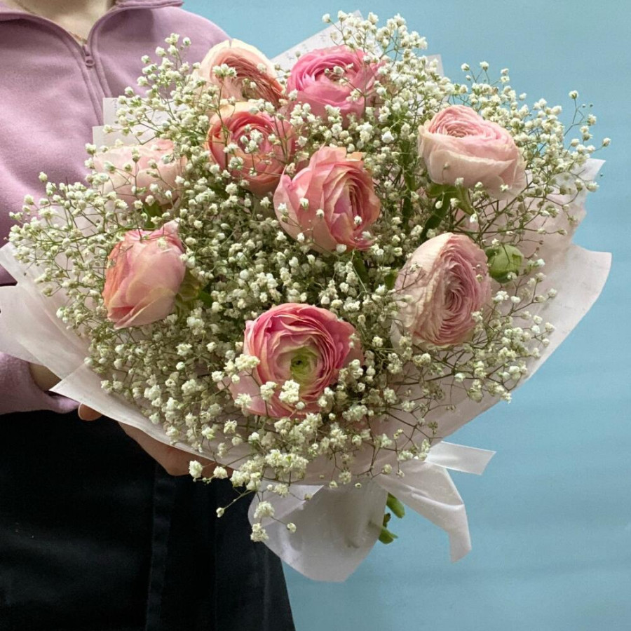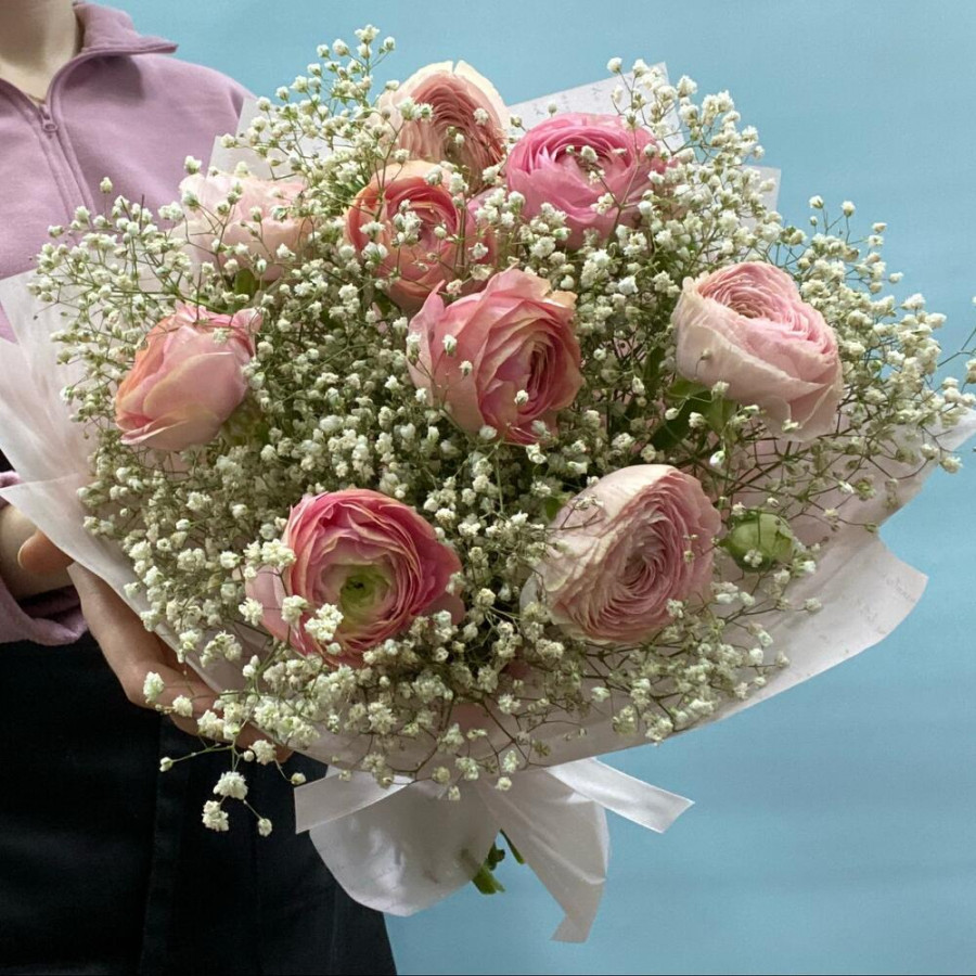 Букет из розовых ранункулюсов с белой гипсофилой в Дубне