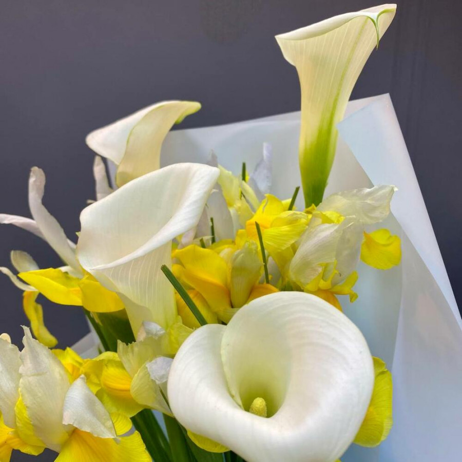 На фото букет из желтых ирисов и беллых калл. В составе: ирис 9 шт, калла 5 шт, дизайнерская упаковка 1 шт, атласная лента 1 шт, . Все цветы свежие и ароматные, букет красиво оформлен и отлично подходит для подарка. Доступна доставка цветов или самовывоз.