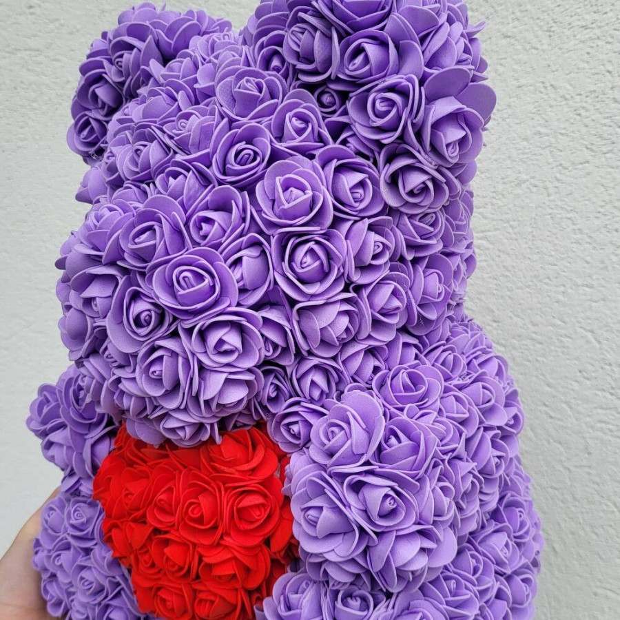 На фото фиолетовый мишка из роз. В составе: . Все цветы свежие и ароматные, букет красиво оформлен и отлично подходит для подарка. Доступна доставка цветов или самовывоз.