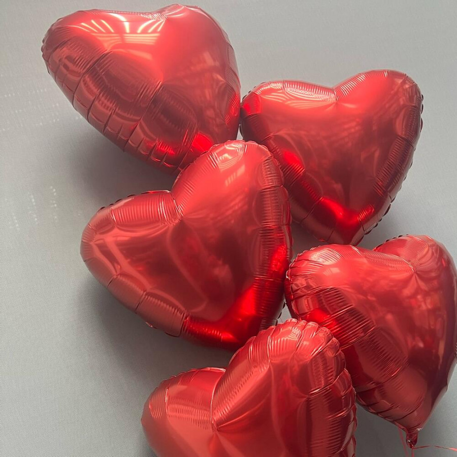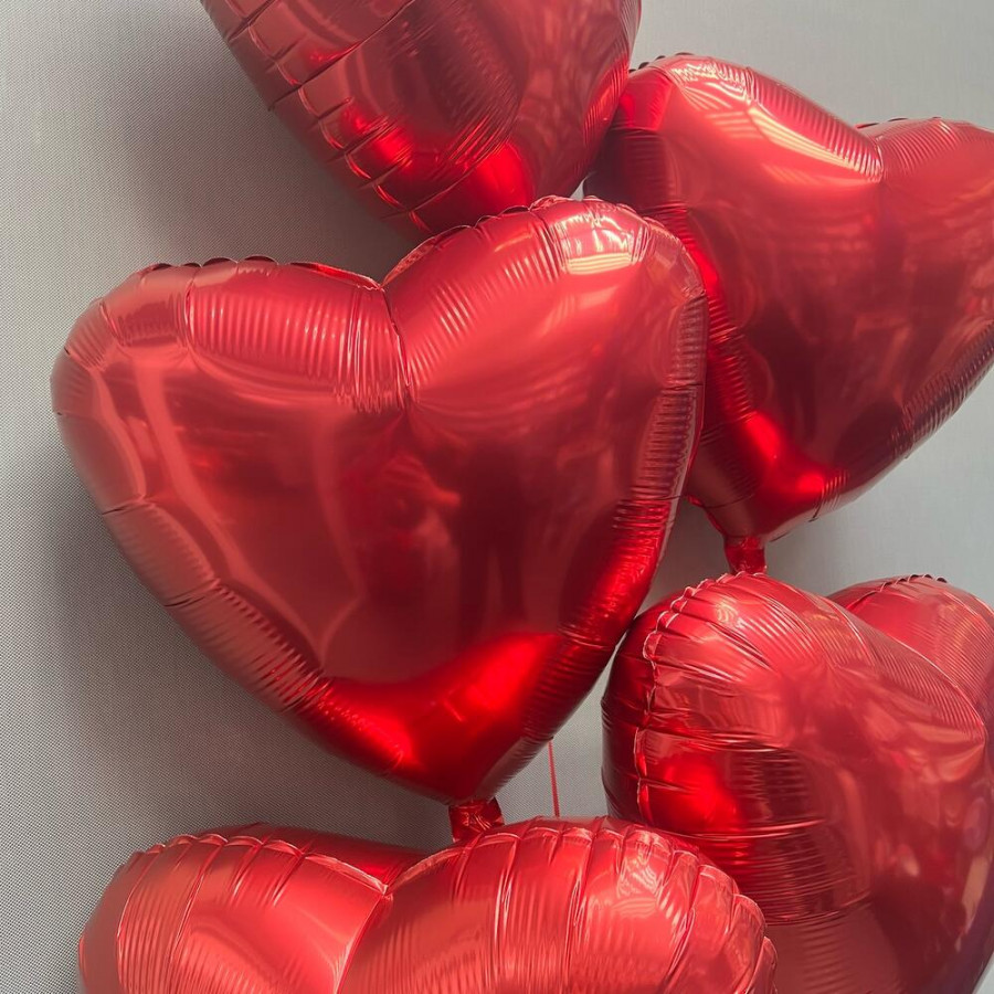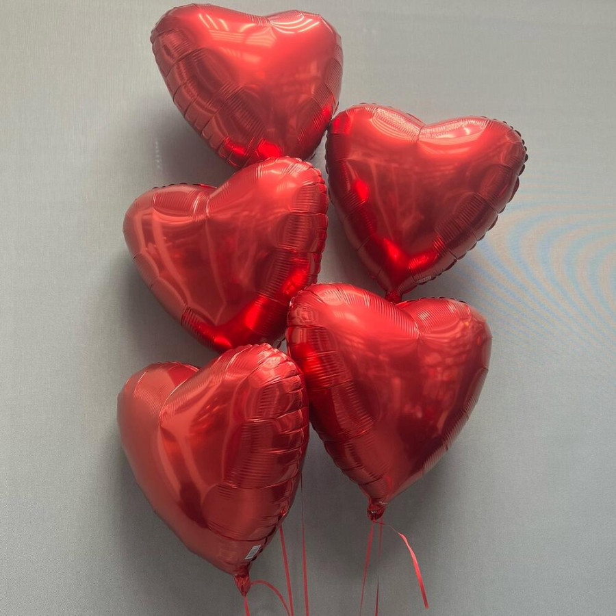 На фото воздушные шары в форме сердца 5 шт. В составе: . Все цветы свежие и ароматные, букет красиво оформлен и отлично подходит для подарка. Доступна доставка цветов или самовывоз.